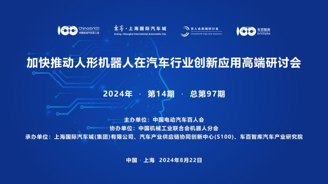 8月22日,由中国电动汽车百人会主办,中国机械工业联合会机器人分会协办,上海国际汽车城(集团)有限公司、汽车产业供应链协同创新中心(S100)、车百智库汽车产业星空官网共同承办的“加快推动人形机器人在汽车行业创新应用”高端研讨会,暨百人会2024年第14期(总第97期)高端研讨会,在上海嘉定顺利召开。研讨会由百人会副秘书长师建华主持。