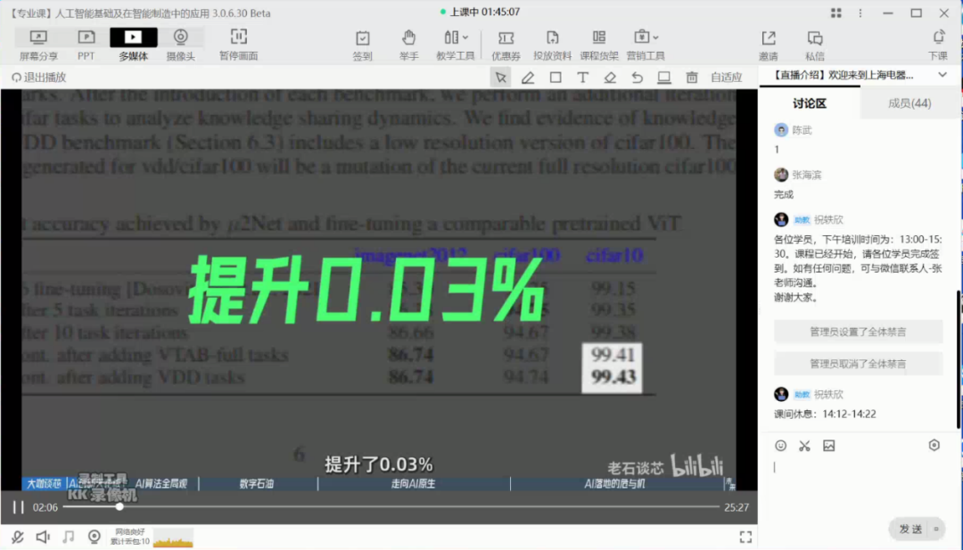 本次培训采取线上直播形式,参加学员共计44人,来自中国电信股份有限公司上海机器人星空官网、中国联合网络通信有限公司上海市分公司、中移(上海)信息通信科技有限公司、上海人工智能创新中心、宝信软件股份有限公司、上海建工集团投资有限公司、上海浦东发展银行股份有限公司、上海复旦微电子集团股份有限公司、健康云(上海)数字科技有限公司、新智道枢(上海)科技有限公司、上海有个机器人有限公司等30多家企事业单位。