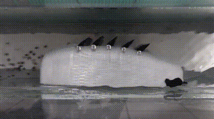 在游泳时,机器鱼会时不时张大嘴巴来收集水源,当“肚子”里的水满了之后,它就会闭上嘴巴,打开百叶窗状鳃瓣,并通过抬高腔底将水从鳃瓣中排出,这样附着在鳃瓣上的细网可以让水流出去,但会将水中的塑料颗粒过滤出来,留在自己的身体里。