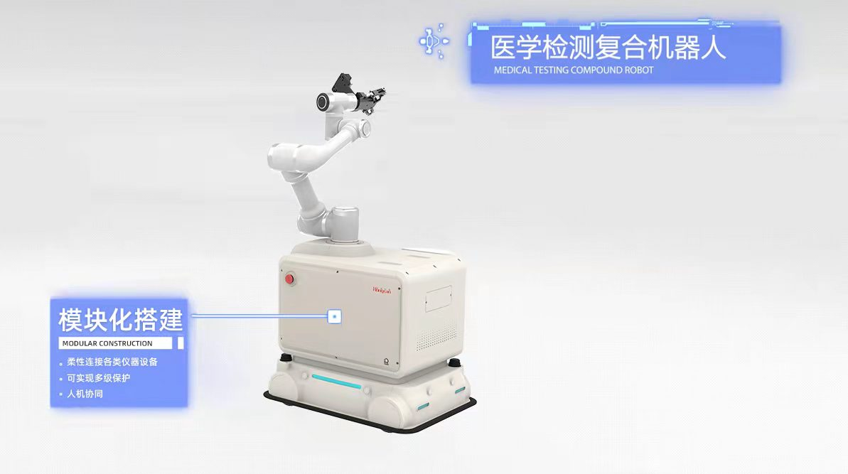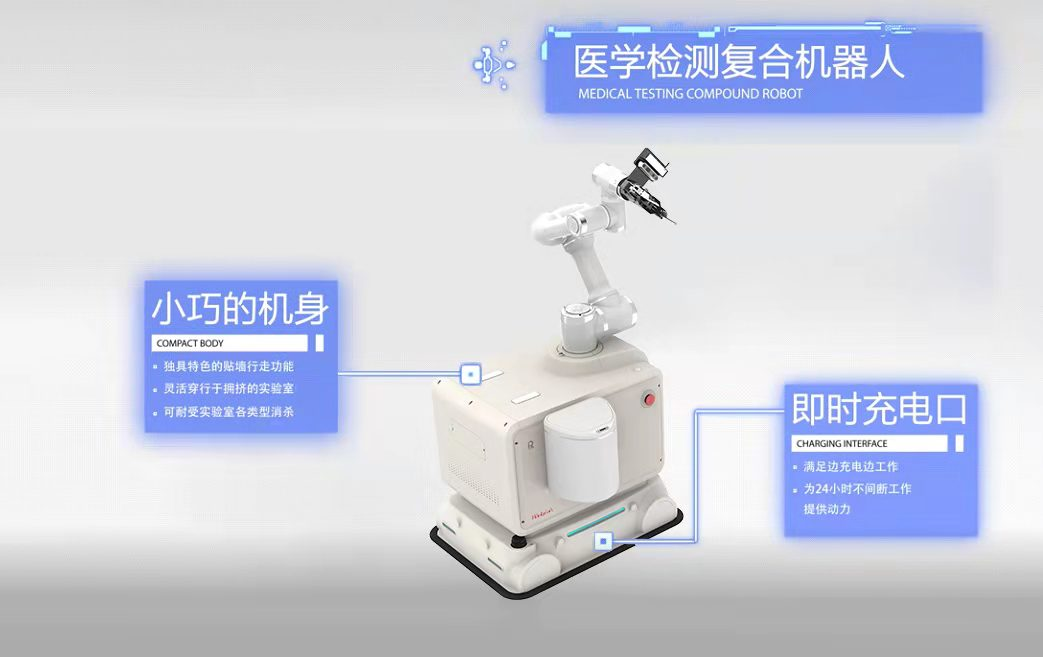 医学检测复合机器人以实际的检测设备为依托,通过自主开发中控系统,在实验室内进行模块化搭建,柔性连接各类仪器设备。