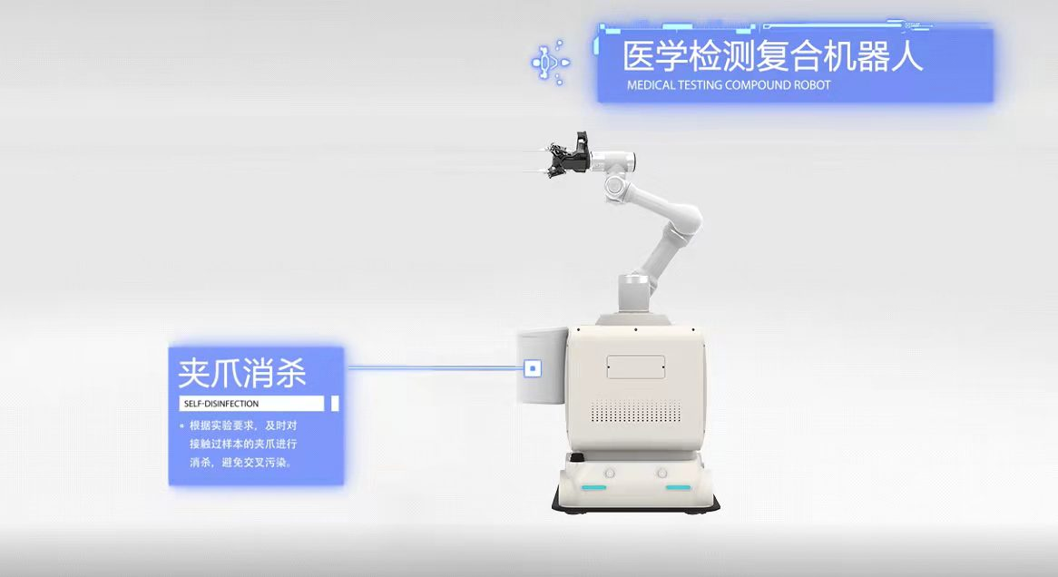 医学检测复合机器人具有独特的外形和外部接口设计,自身可耐受多种类型的消杀,耐酒精喷洒、耐各种消毒液擦拭和紫外灯照射。开创性地配置夹爪消毒装置,在作业过程中,随时实现自我清洁,最大程度地避免了交叉污染。